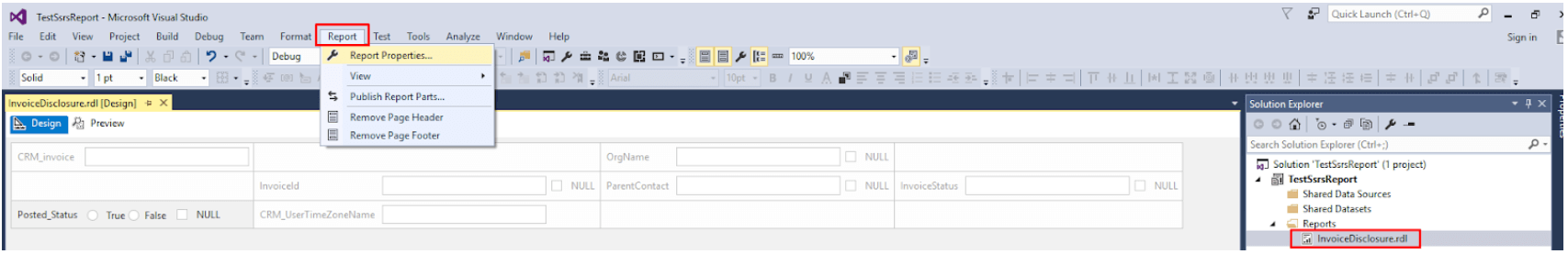 Open the report in Visual Studio. select Report -> Report Properties from the menu. (This option is only available if the report is open and you have selected an element on the report designer/previewer.)