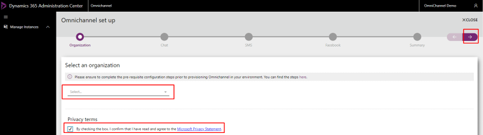 Select the organization, Check the checkbox for privacy terms and click on purple continue arrow to proceed.
