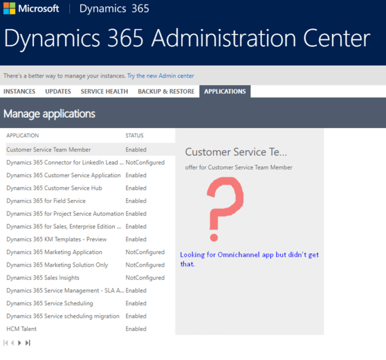 Step 2: After Completing the Setup open Dynamics 365 Administration Center. Under the Application Tab look for Omnichannel for Customer Service App.