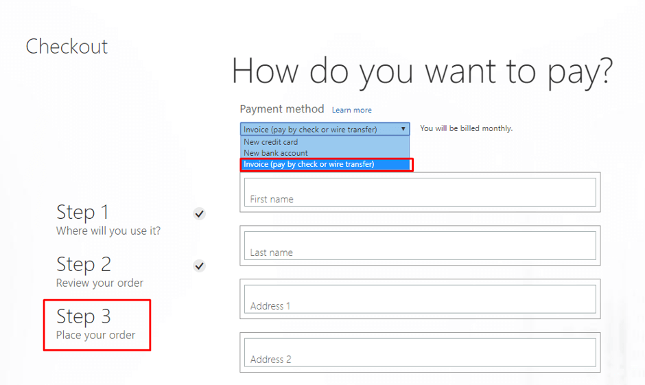 5. Select the option of Invoice to skip credit card details, fill details and click on Place Order button at the bottom. You will get a confirmation message.