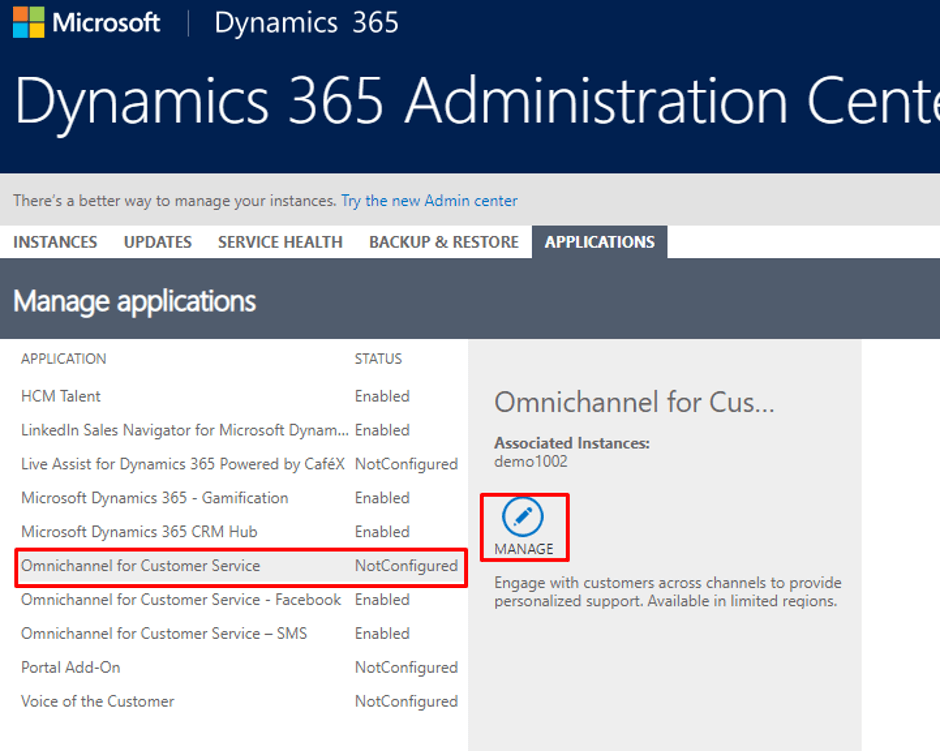 Step 1: Select Omnichannel for Customer Service in Dynamics 365 Administration Center under the Application Tab, and click on Manage.